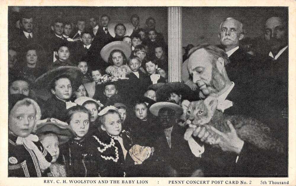 Clarence Herbert Woolston was a Baptist minister in the Kensington neighborhood of Philadelphia in the early 1900s, a preacher who had discovered that the best way to reach children was to meet them where they were. He ran what he called Penny Concerts, services priced at one cent admission, and he filled them with magic tricks, object lessons, and the occasional exotic animal. A postcard survives of Woolston holding a baby lion.
