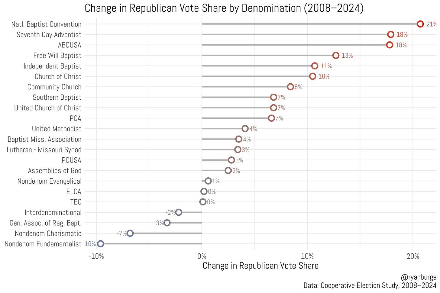 If you’re wondering why traditionally apolitical religious groups are suddenly voting like they’ve got a Sean Hannity subscription, Ryan Burge’s chart based on data from the Cooperative Election Study (Harvard) might offer a clue. Burge, a political scientist who tracks religion and politics like a hawk, looked at how different denominations voted between 2008 and 2024. His data shows that Seventh-day Adventists have increased their Republican vote share by 18 points. The National Baptist Convention is up 21. The American Baptist Churches USA? Also up 18. These aren’t evangelical megachurches in Dallas. These are historically cautious, sometimes skeptical, and often socially quiet religious groups.