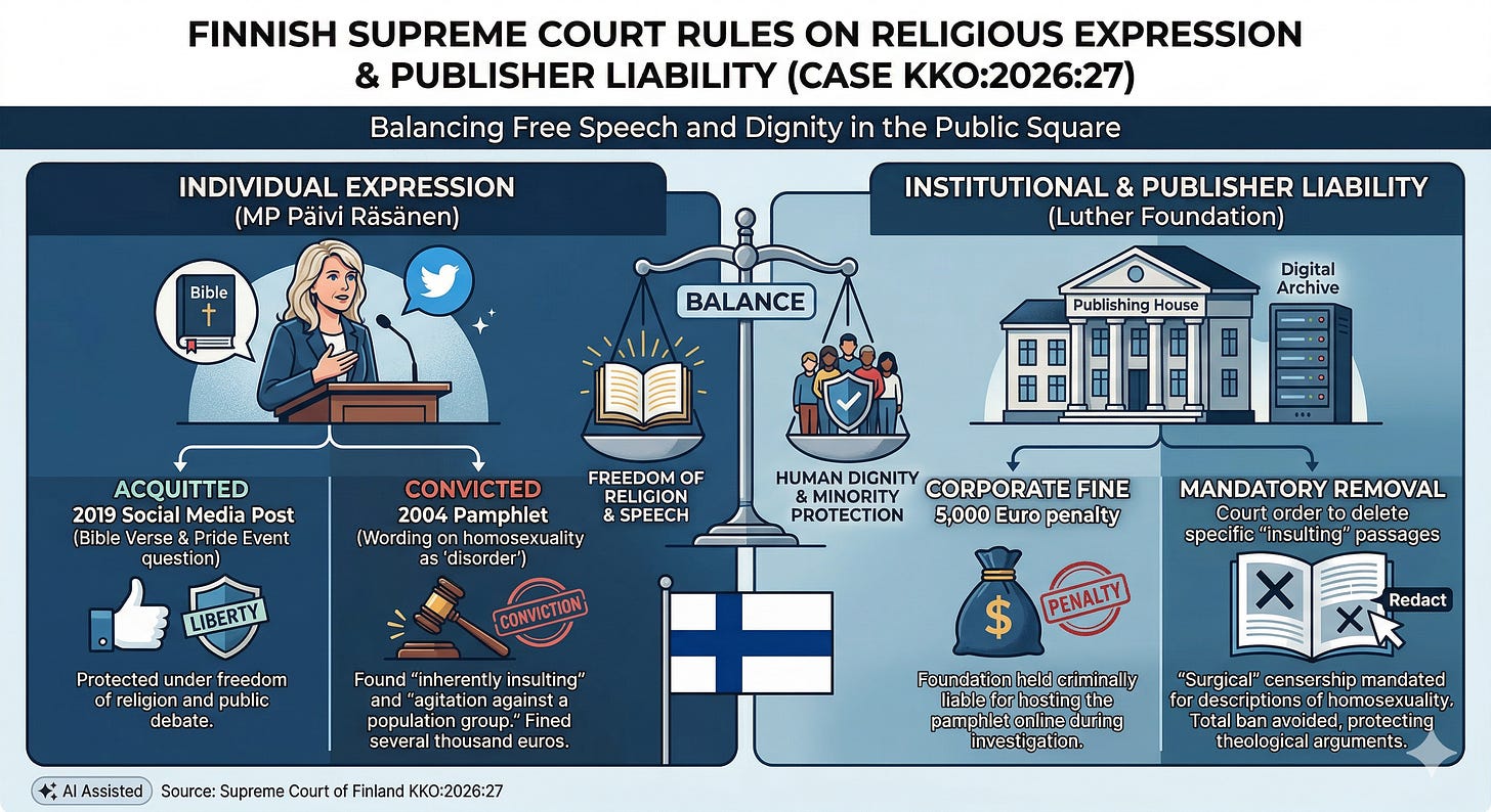 The Supreme Court of Finland has issued a final verdict in the long-running “Bible Trial,” convicting Member of Parliament Päivi Räsänen and Bishop Juhana Pohjola of “agitation against a population group.” While the Court acquitted Räsänen for a 2019 tweet featuring a Bible verse, it found that specific descriptions in a 2004 pamphlet she authored were “inherently insulting” to homosexuals. The Court levied a 5,000 euro corporate fine against the Luther Foundation Finland for hosting the document online. It also ordered the publisher to remove the offending passages immediately. This ruling establishes a precedent that publishers are legally responsible for the “insulting” content of their digital archives, even if the material was created twenty years ago. The defense maintains that this constitutes a violation of free speech and religious autonomy