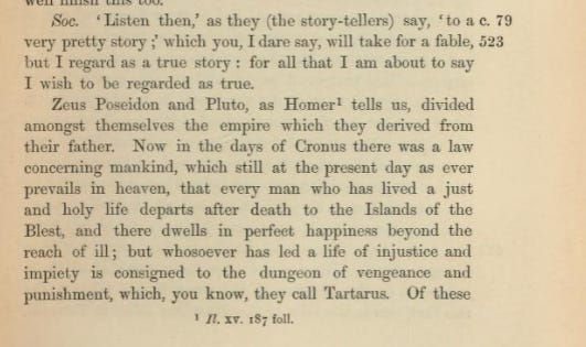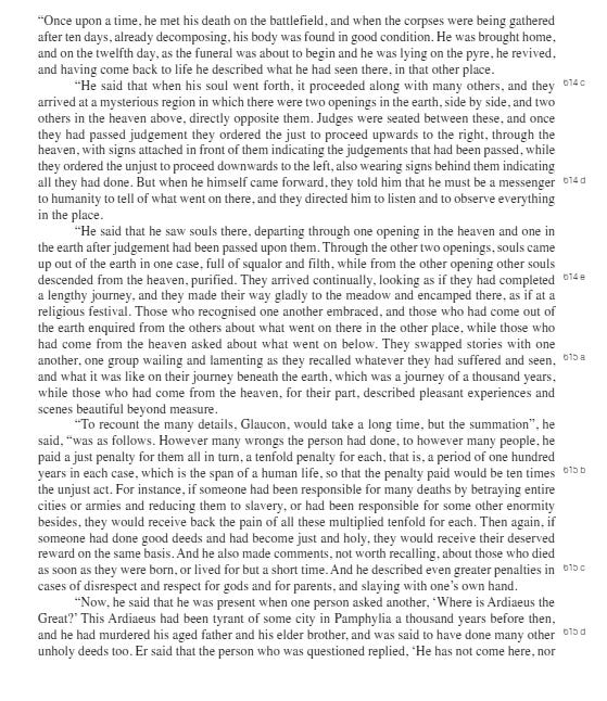 Note: After I posted about the differences between the Kirk Cameron and Ray Comfort’s beliefs about hell, an alert reader contacted me and asked if I had the specific quotations from Plato that undergirded the traditional (and I would argue extra-Biblical) view of eternal torment. I realized that this is something that a lot of people probably would simply accept but others require receipts, so here are the receipts. These are long quotations and I’ve included photos of excerpts from Plato’s writings with links to the originals so you can read them for yourself. I would also advise that this is not a writing about the “State of the Dead” or what happens when you die but rather focuses on the idea of torment in hell. I welcome dialogue on this point. – MP