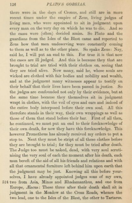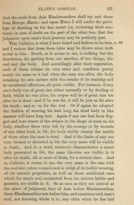 The clearest statement appears in Gorgias. Socrates recounts a myth of judgment in which souls are stripped of earthly status and examined for justice.
