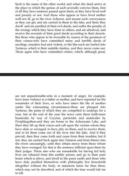This is eternal punishment. It is not corrective. It is not temporary. Plato presents it as moral warning rather than demonstrated reality, yet the structure is unmistakable.