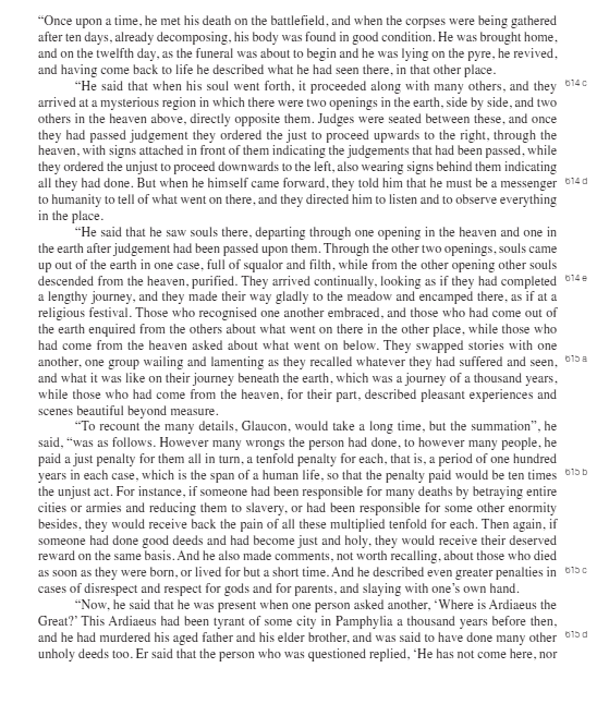 Note: After I posted about the differences between the Kirk Cameron and Ray Comfort’s beliefs about hell, an alert reader contacted me and asked if I had the specific quotations from Plato that undergirded the traditional (and I would argue extra-Biblical) view of eternal torment. I realized that this is something that a lot of people probably would simply accept but others require receipts, so here are the receipts. These are long quotations and I’ve included photos of excerpts from Plato’s writings with links to the originals so you can read them for yourself. I would also advise that this is not a writing about the “State of the Dead” or what happens when you die but rather focuses on the idea of torment in hell. I welcome dialogue on this point. – MP