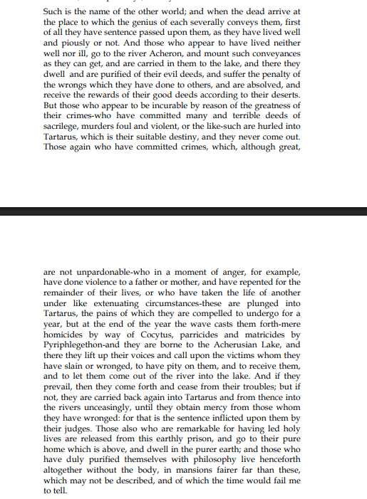 “Those who are judged to be incurable, by reason of the greatness of their crimes, are made examples; they are hung up in prison in the underworld, in Tartarus, as a spectacle and a warning… These men are punished for all time, and are never released.”