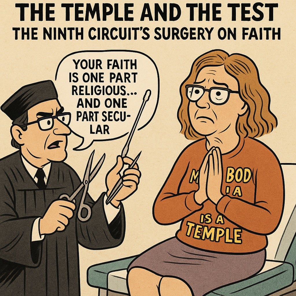 Judge Richard Seeborg split her mind open like a lab specimen. He acknowledged the religious half — the temple of the Holy Spirit. That was genuine. But the other half, the terror of ethylene oxide, that was secular. Personal. Nothing holy about it. “Premised on her interpretation of medical research,” he wrote. The court severed her brain into two piles, tossed the secular stack in the trash, and declared the claim dead.