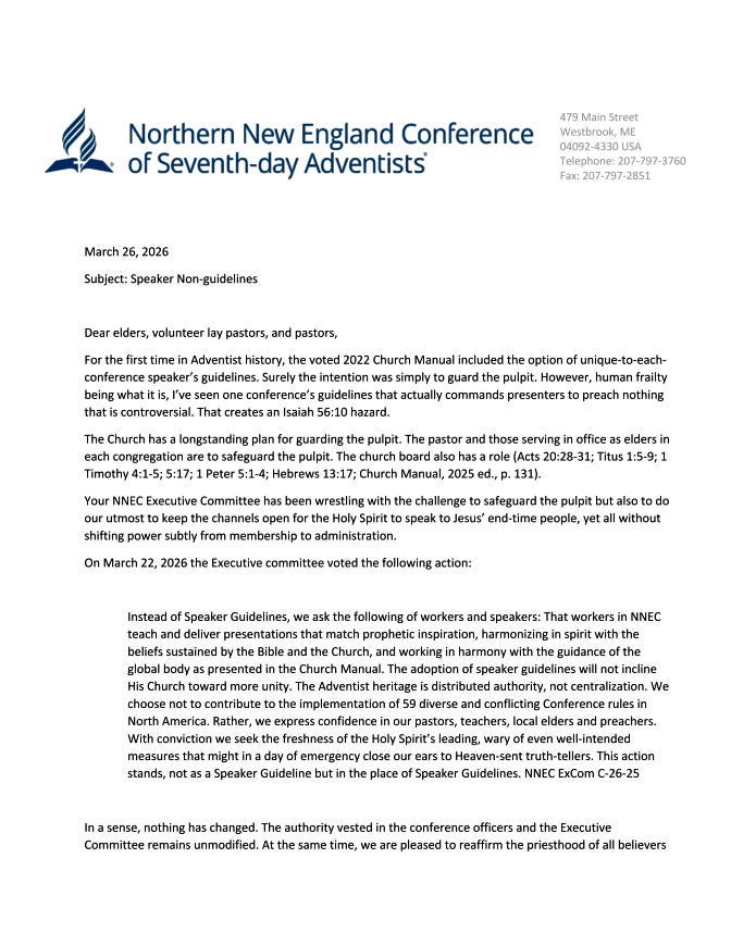 On March 26, 2026, Larry Kirkpatrick, executive secretary of the Northern New England Conference of Seventh-day Adventists, sent a letter to the conference’s elders, volunteer lay pastors, and pastors announcing a formal decision: NNEC would not adopt speaker guidelines. It would not circulate a list of approved or unapproved presenters. It would not, in effect, tell local congregations and their shepherds which voices were fit to enter the pulpit.