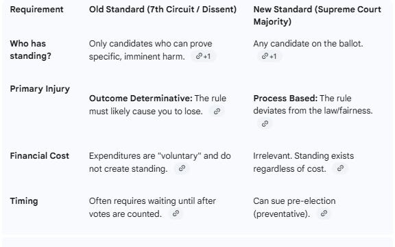 This approach aligns the judiciary more closely with the role of an election referee rather than a dispute settler. By rejecting the need for a candidate to show they might lose, the Court acknowledges the reality that election integrity is often litigated in the abstract before votes are cast. If the Court had upheld the Seventh Circuit, it would have created a paradox where a candidate could only sue if the election was close enough to be stolen.