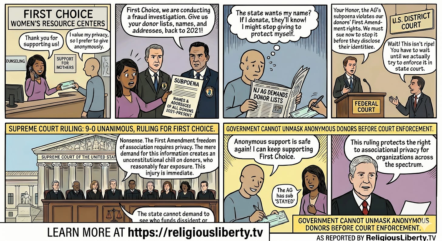In a unanimous 9-0 decision on April 29, 2026, the U.S. Supreme Court ruled that First Choice Women’s Resource Centers has standing to challenge a New Jersey subpoena in federal court. The state’s Attorney General sought 28 categories of documents, including the names and addresses of private donors, as part of a consumer fraud investigation. Justice Neil Gorsuch wrote that such demands for private information inevitably discourage individuals from associating with groups that hold dissident or controversial views. The Court rejected New Jersey’s argument that the group had to wait for a state court to enforce the subpoena before filing a federal civil rights claim. This ruling reinforces the First Amendment right to “associational privacy” for nonprofits across the political and religious spectrum.