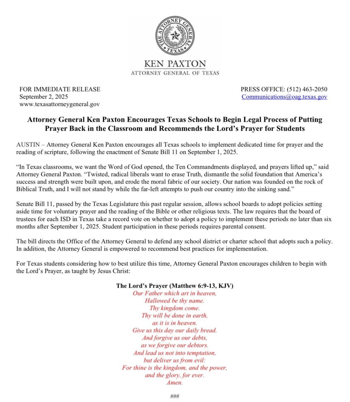 AUSTIN — On September 2, Texas Attorney General Ken Paxton told every school district in the state to clear their throats and prepare for prayer. Backed by Senate Bill 11, which became law September 1, Paxton urged schools to begin with the Lord’s Prayer from the King James Bible.