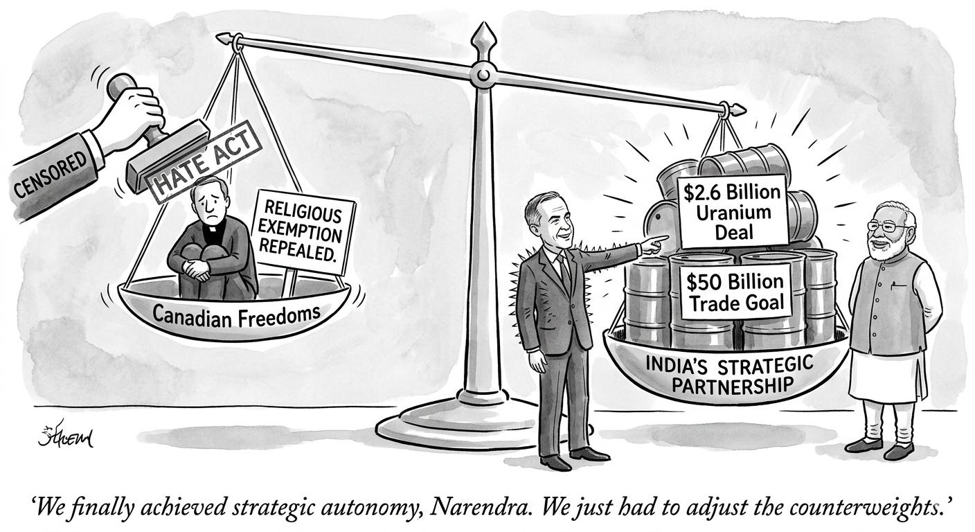Under the leadership of Prime Minister Mark Carney, a man whose transition from central banker to sovereign arbiter has been marked by the cool, bloodless logic of a balance sheet, Canada is attempting a “Great Reset” with New Delhi. The price of admission to this new era of partnership? A 2.6 billion dollar uranium contract, a 50 billion dollar trade target, and the systematic dismantling of a few inconvenient domestic freedoms. As the bill cleared the House of Commons on March 25, 2026, one cannot help but notice that the “Hedgehog Strategy,” Carney’s doctrine of strategic autonomy, looks less like a prickly defense of sovereignty and more like a submissive curl into a fetal position before the demands of a rising superpower.