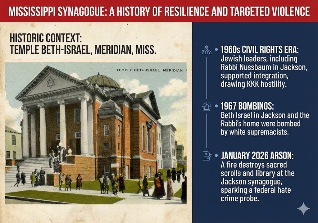 State and federal authorities have arrested an unnamed suspect for arson following a fire that severely damaged Beth Israel Congregation in Jackson, Mississippi, early Saturday, January 10, 2026. The blaze destroyed the synagogue’s library and two Torah scrolls. While no injuries occurred, the attack has drawn sharp parallels to a 1967 Ku Klux Klan bombing of the same institution. Jackson Mayor John Horhn condemned the act as “antisemitism” and “terror.” This incident occurs as the Anti-Defamation League reports record-breaking numbers of antisemitic incidents across the United States. Federal agents are currently investigating potential hate crime charges.